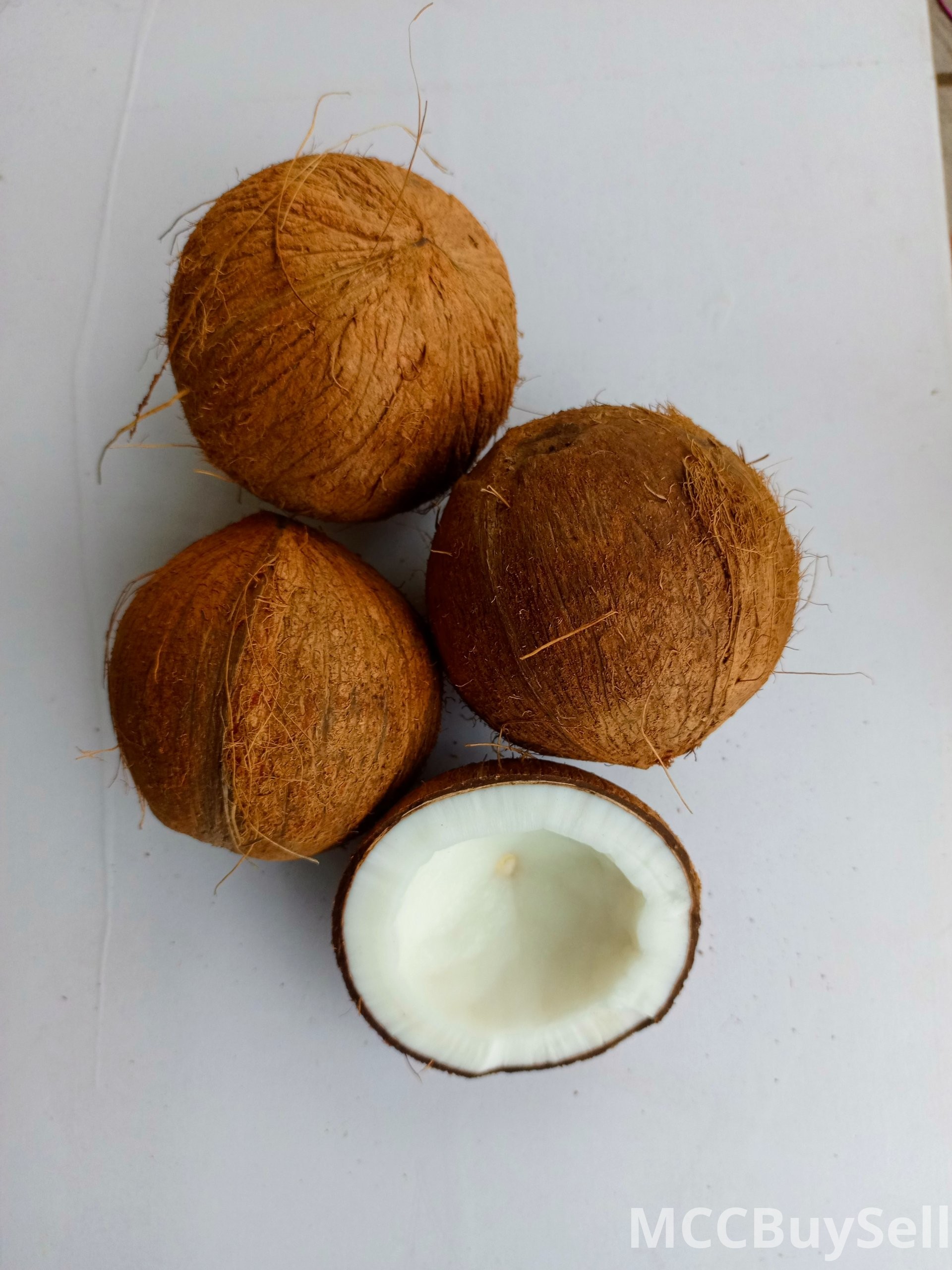 . Coconut are large shaped fruit typically brown in color thought they can also be green or yellow.