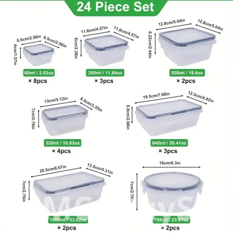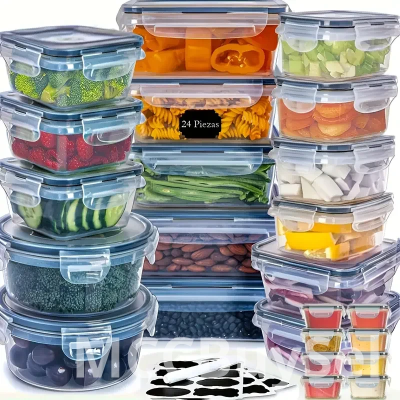 This set includes 48 pieces: 24 food storage containers and 24 easy-to-secure lids, perfect for travel, outdoor picnics, pantry organization, and kitchen use. It also comes with a marker and labels.